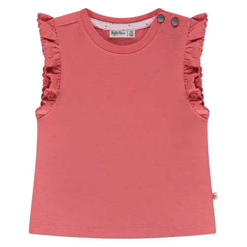 Dit Babyface meisjes T-shirt in rood is een praktische basic voor elke dag, met extra detail door de ruches. De effen kleur maakt het shirt makkelijk te combineren, terwijl het zachte stretchkatoen soepel met je baby meebeweegt. Geschikt voor de dagelijkse outfits in de eerste maanden.Comfortabel T-shirt met speelse details Gemaakt van 95% katoen en 5% elastaan voor een zachte, rekbare stof Korte rechte mouwen, prettig voor binnen en op warme dagen Ronde hals met drukknoopsluiting op de schouder, waardoor aankleden en uitkleden eenvoudig gaat Effen rode kleur, makkelijk te combineren met broekjes, leggings of een rokje Ruches als speels detail langs de schouder voor een subtiel accent Geschikt voor baby en new born maten, afgestemd op de Babyface daily collectieHandig voor elke dagDoor de drukknoop bij de hals hoeft het shirt niet over het hoofd te worden geduwd, wat prettig is voor jou en je kleintje. De soepele stof biedt voldoende bewegingsvrijheid, of je baby nu ligt, kruipt of wordt gedragen. Het T-shirt vormt een praktische basis in de kledingkast, die je snel pakt en makkelijk wast.Babyface: vertrouwde stijl voor kleintjesBabyface richt zich speciaal op de allerkleinsten, met kleding die comfortabel aanvoelt en er verzorgd uitziet. De ontwerpen sluiten aan bij het dagelijks leven met een baby, waarbij zachte materialen en doordachte details centraal staan. Met dit T-shirt kies je voor een item dat past in een moderne babycollectie.Een zachte, praktische basic met een rustige uitstraling voor elke dag.
