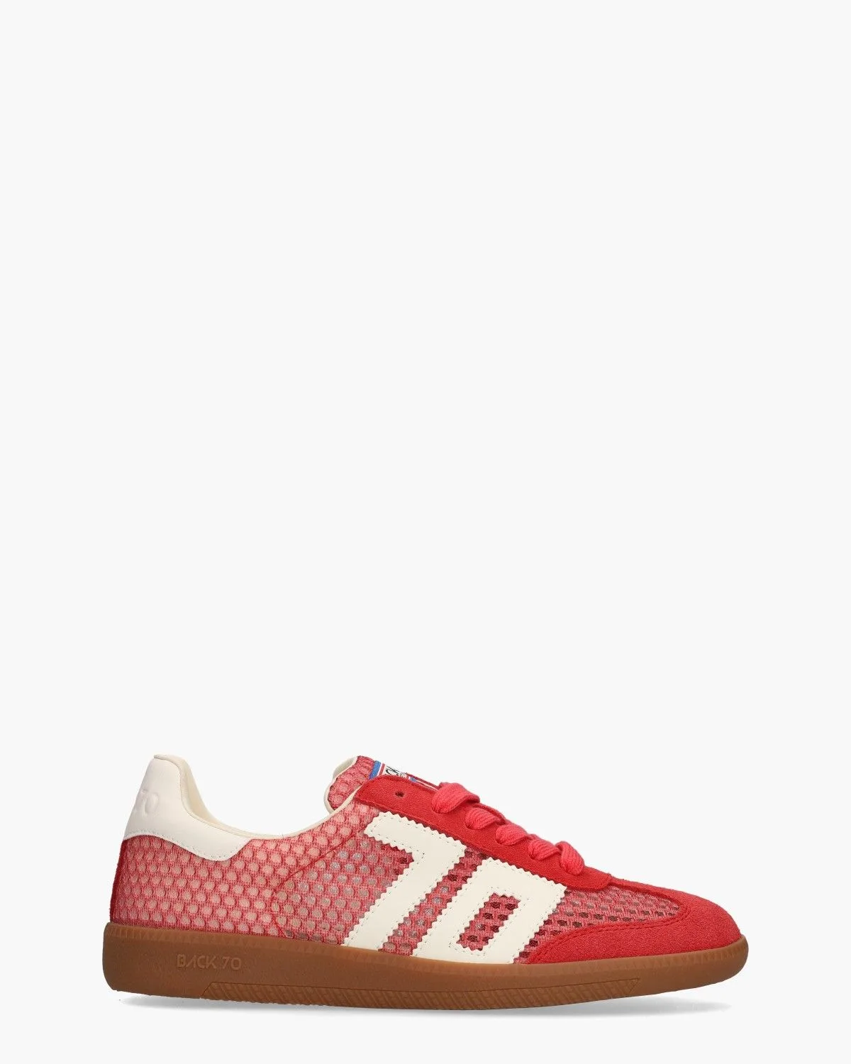 Een vintage icoon in een felle kleur. De Ghost Mesh damessneakers van Back 70 vallen op door het rode suède en het luchtige mesh bovenwerk. Off-white leren details zorgen voor een frisse belijning. Kartelranden en fijne stikdetails onderstrepen het retro DNA. De gummy rubberen zool geeft het silhouet een authentieke 70's uitstraling.