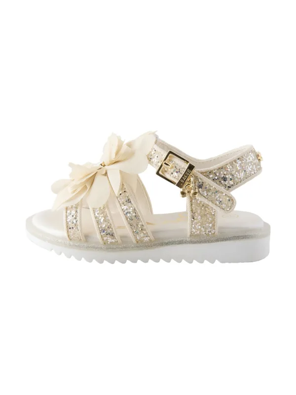 Design: Profielzolen; Type sluiting: Riemsluiting; Materiaal: Textiel; Schoenneus: Open toe; Extra's: Glitterend, Applicaties; Hakhoogte: Platte hak (0-3 cm)
