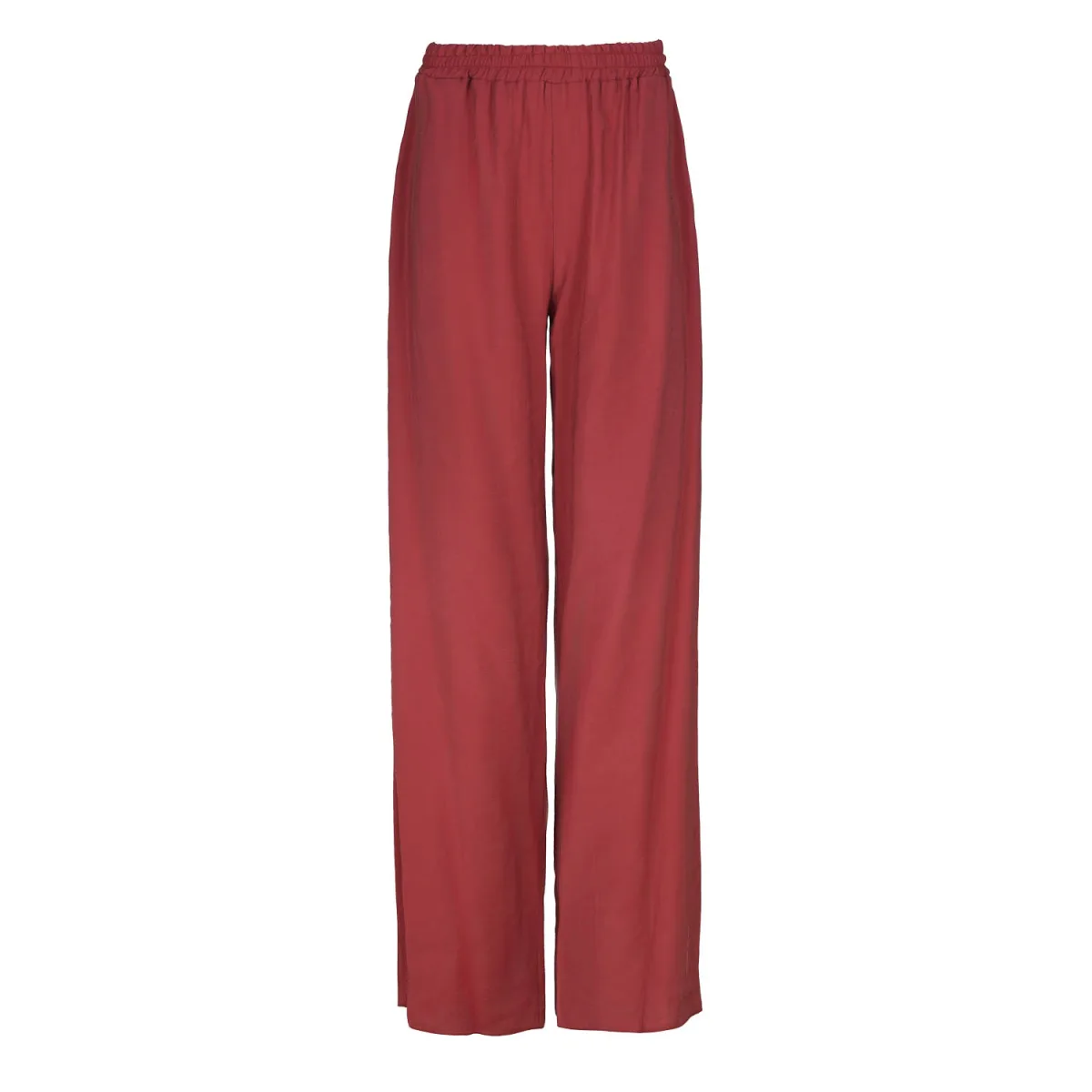 Deze baksteenrode palazzo broek met wijde pijpen is gemaakt van rayon crêpe stof. Er zitten binnenzakken links en rechts. De tailleband is 4 cm breed en heeft elastiek aan de binnenkant.