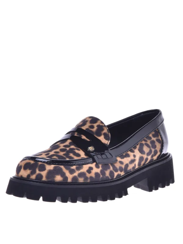 Design: Profielzolen, Materiaal mix, Elastische inserts; Type sluiting: Slip; Type hak: Blokhak; Materiaal: Leer; Motief: Dierenprint; Materiaal: Kunststof/rubber, Glad leer, Suède; Schoenneus: Ronde neus; Extra's: Label plaatje, Flexibele zool; Hakhoogte: Platte hak (0-3 cm)