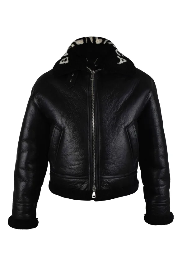 Bomber Balenciaga zwart.Glanzend leer en wollen leer.Opstaande kraag met wit Balenciaga -logo.Ritssluiting.Twee opgestikte zakken.Zilveren metalen details. Vinyl materiaal.Gemaakt in Italië.