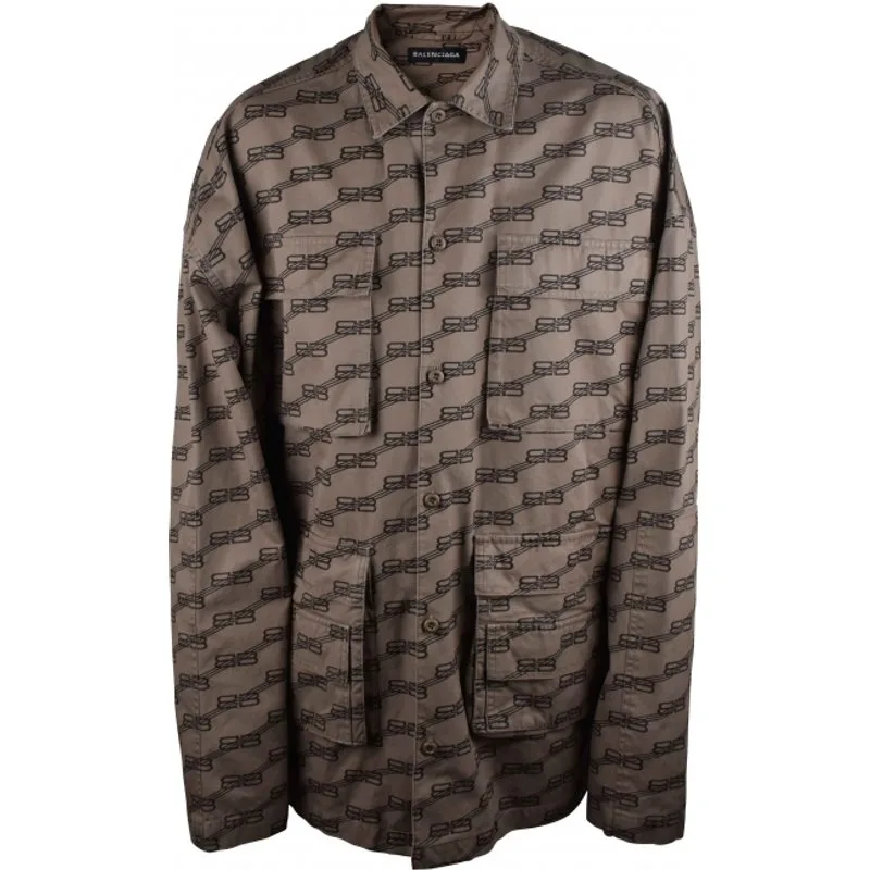 Balenciaga beige cargooverhemd.Bruin BB-logo overal diagonaal bedrukt.Knoopsluiting.4 zakken aan de voorkant.Klassieke reverskraag.Lange mouwen.100% katoen.Gemaakt in Italië.
