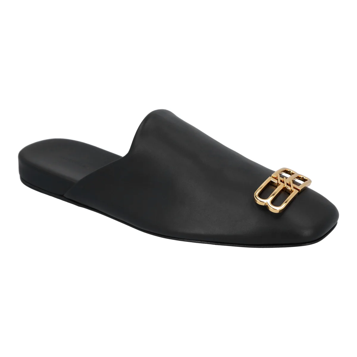 Balenciaga mule vervaardigd uit soepel zwart leer en versierd met een goudkleurig metalen BB-detail. Voorzien van een licht vierkante neus, leren voering en een leren zool. Kleur: Zwart/goud lux