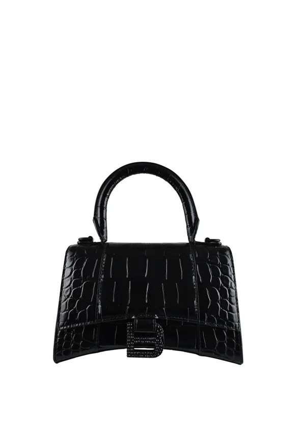 Handtas Balenciaga Hourglass XS zwart.Kalfsleder met krokodillenmotief.Signatuur B logoplaatje met zwarte strass-steentjes.Zwart metalen sierrand.Bovenklep met drukknoopsluiting.Afgerond handvat.Afneembare en verstelbare schouderriem. Afmetingen: 19 cm x 12 cm x 8 cm.XS model.Made in Italy.