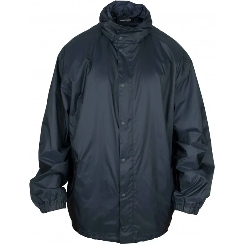 Blauwe waterdichte jas van Balenciaga nylon.Wit logo op de achterkant in verschillende kalligrafieën.Knoopsluiting.Hoge kraag met afneembare capuchon.Lange mouwen.Zijzakken.Elastieken in de taille en mouwen.Gemaakt in Italië.