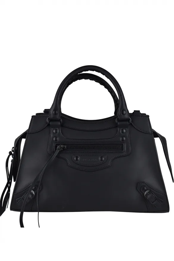 Grote Balenciaga neo-stadstas van zwart leer.Tone-sur-tone logopatch aan de voorkant.Zwarte metalen details.Twee gerolde handvatten.Afneembare, verstelbare schouderriem met schuifkussen, karabijnhaken en knoopsluiting. Zwarte tweewegrits.Kaartsleuf aan de binnenkant.33 x 20 x 13 cm.Gemaakt in Italië.