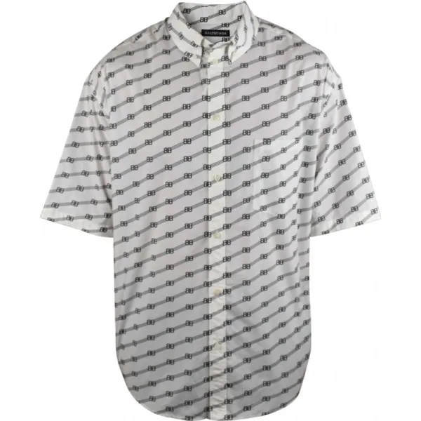 Wit katoenen overhemd van Balenciaga.Zwart 'BB'-monogramlogo diagonaal bedrukt.Knoopsluiting.Borstzak.Korte mouwen.