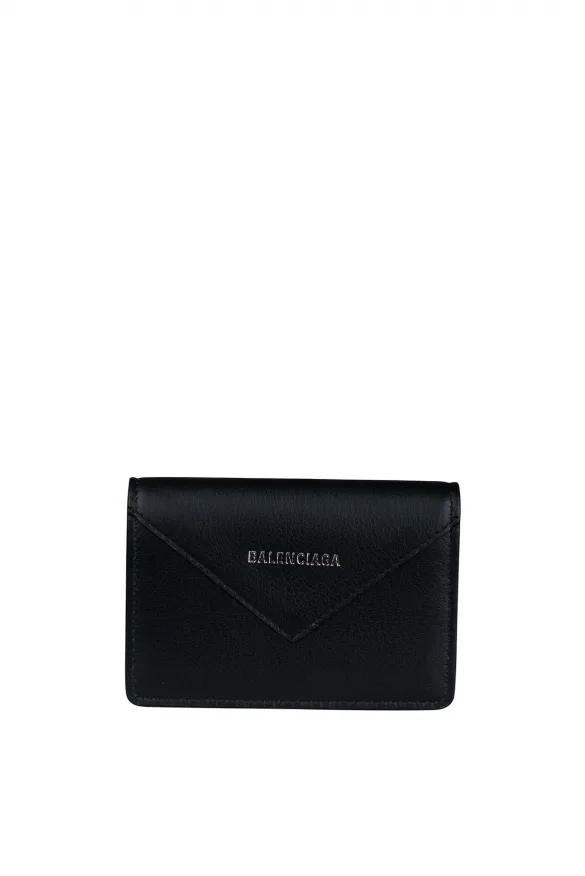 Balenciaga mini-portemonnee van zwart generfd leer.Envelopstijl. 'Balenciaga'-logo op de voorkant.Afgeronde uiteinden.Bak voor bankbiljetten.2 kaartsleuven.Geïntegreerde portemonnee met drukknoopsluiting.100% leer.Gemaakt in Italië.