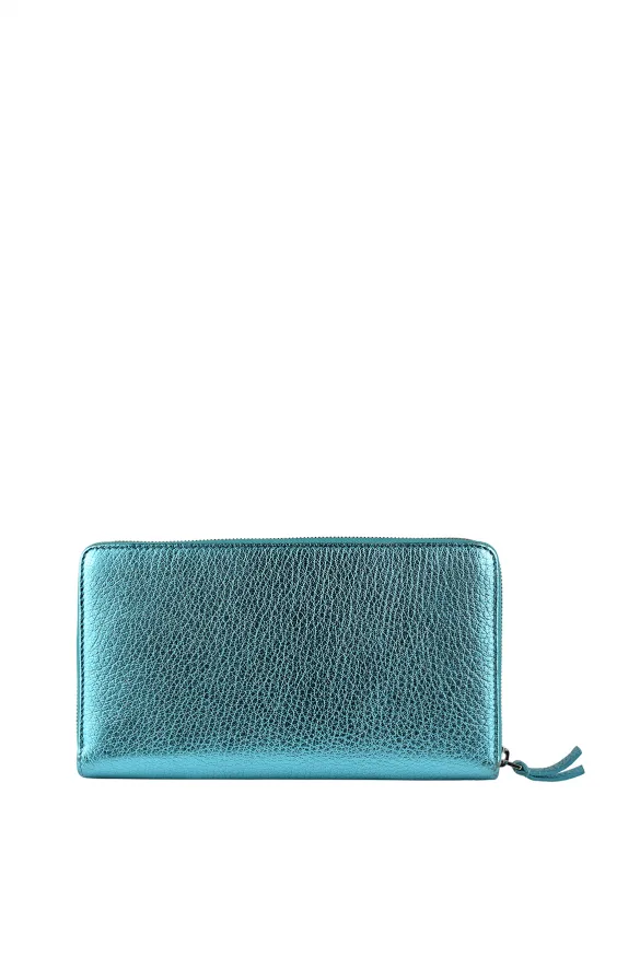 Balenciaga-portemonnee van turquoise metallic kalfsleer.Zwart 'Balenciaga'-logo op de voorkant.Buitenzak met ritssluiting aan de binnenkant.Kaartgleuven.Gemaakt in Italië.