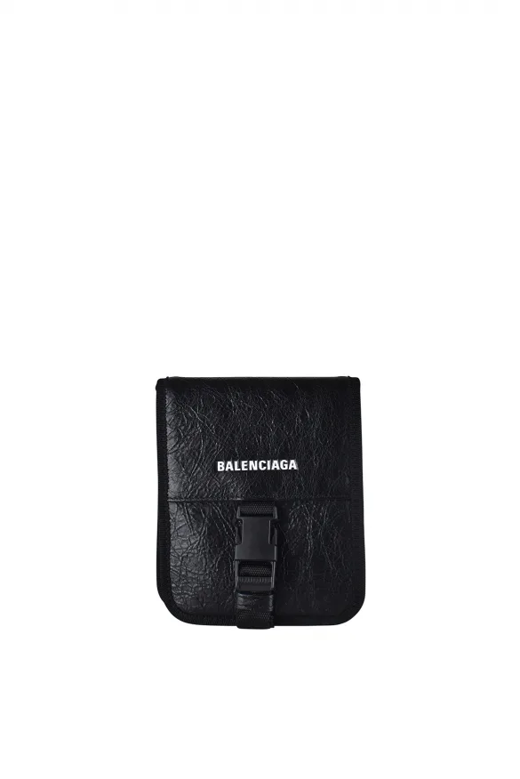 Balenciaga portemonneetas van zwart leer.Witte logoprint op de voorkant.Verstelbare zwarte schouderband.Afmetingen: hoogte: 16, lengte: 13 cm, diepte: 2 cm.Gemaakt in Italië.