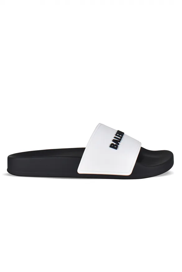 Balenciaga witte en zwarte rubberen slides.Witte band met zwart merklogo.Platte zwarte rubberen zool.Gemaakt in Italië.