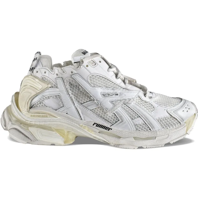 Runner-sneakers Balenciaga wit.Mesh en nylon.Maataanduiding op teen en reliëf op achterkant.Paneelontwerp. Balenciaga logo geborduurd in zwart op de voorkant van de tong.Runner-logo gedrukt op de buitenkant.Witte vetersluiting.Dynamische zool met versteviging aan de achterkant.