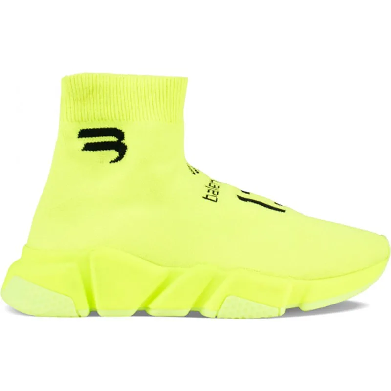 Balenciaga Speed Soccer-sneakers, geel.Technische 3D-mesh.Zwarte print op de voorkant.Zwart logo gedrukt op de buitenkant van de schoen.Logo in reliëf op de achterkant.Fluorescerende gele zool.Gemaakt in Italië.