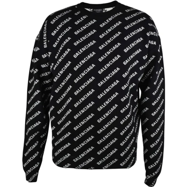 Zwarte trui van katoen en wol Balenciaga.Wit gemonogrammeerd logo Balenciaga diagonaal over het kledingstuk gedrukt.Ronde hals.Geribde boorden.40% katoen, 27% wol, 22% polyester, 10% polyamide.Made in Italy.