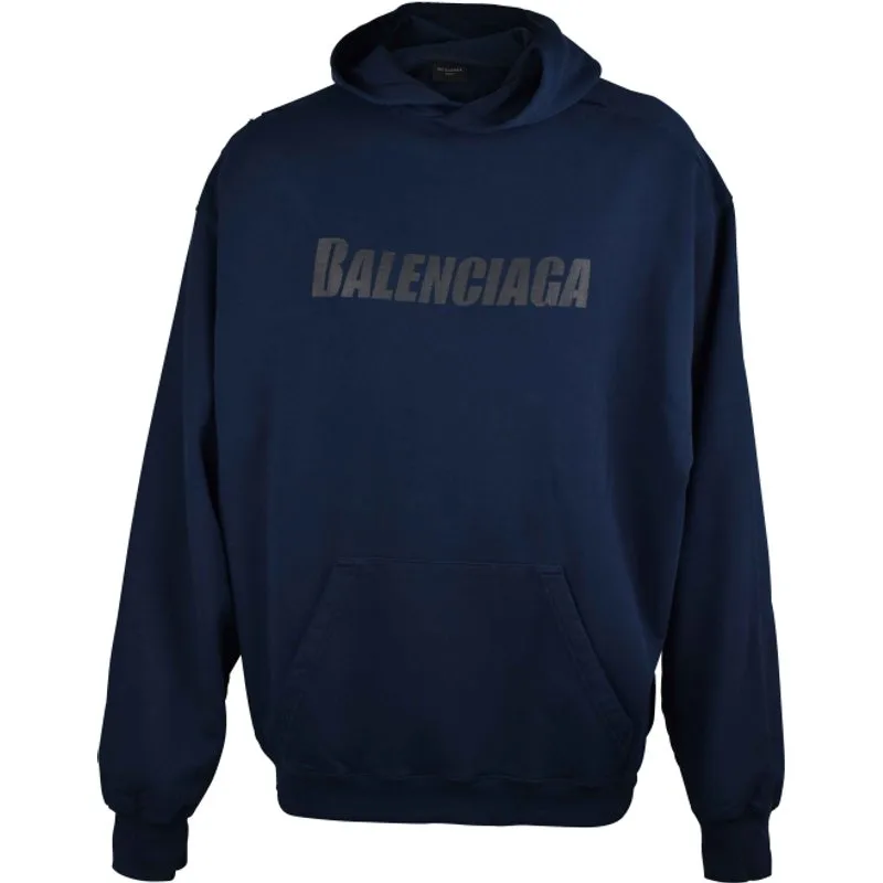 Hooded sweatshirt Balenciaga in marineblauw katoen.Vernietigingseffect.Grijs Balenciaga logo in het midden gedrukt.Kangoeroezak.Ribboorden.Oversized model.