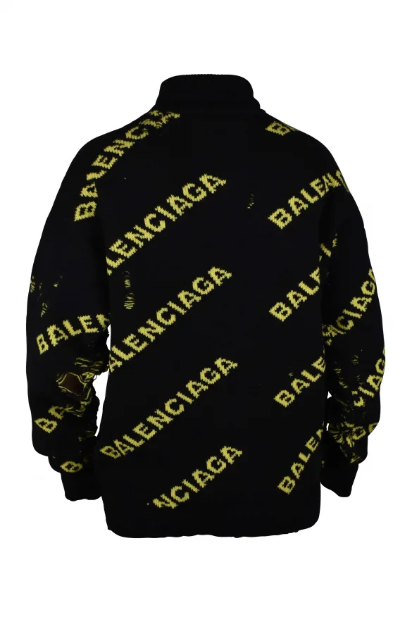 Zwarte gebreide Balenciaga-trui.Diagonaal Balenciaga-logo in geel over de hele trui.Destroy-effect.Turtleneck.Lange mouwen.Geribbelde manchetten en mouwen.Gemaakt in Italië.