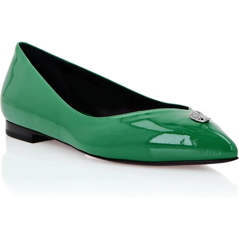 Ontdek de tijdloze aantrekkingskracht van ballerina's. Kijk naar deze versie die opnieuw is ontworpen in perfecte Plein-stijl. Lakkleur De iconische doodskop in juweeluitvoering op de vamp Echt lederen zool Bespikkelde lederen voering Label met logo op bespikkeld voetbed