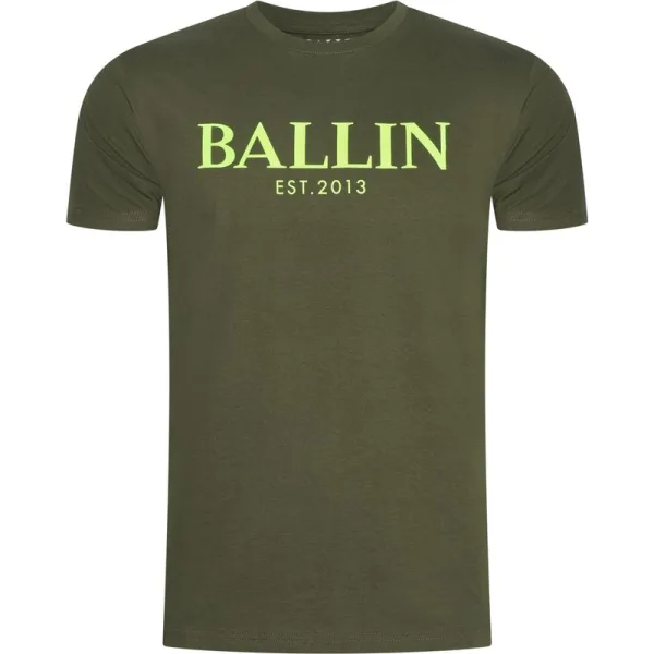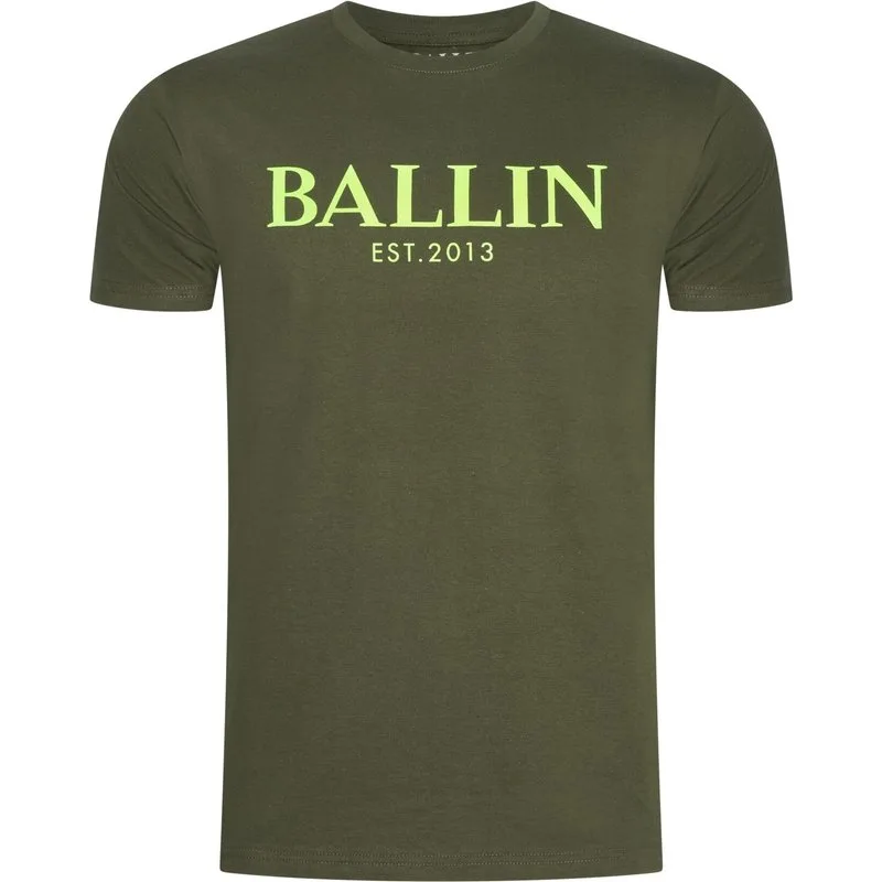 T-shirt heren van het merk Ballin Est. 2013 Op het groene T-shirt voor mannen staat het Ballin logo in Fluor geel. Ook heeft het T-shirt een normale pasvorm. Je kunt het T-shirt voor mannen goed combineren op je outfit met een short chino, bermuda of een korte spijkerbroek. Materiaal: 100% katoen Kleur: Kaki - Groen