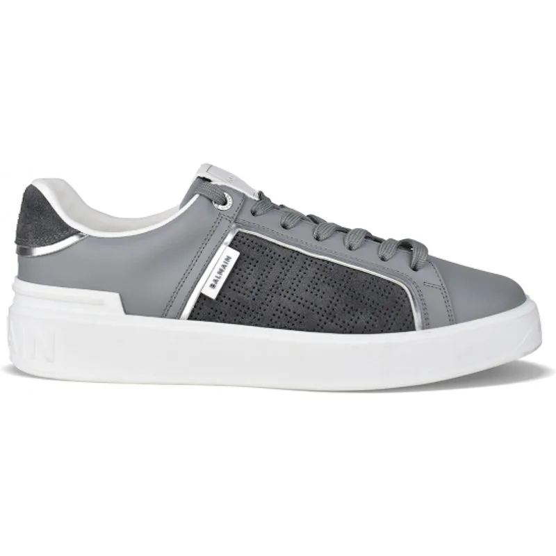 Balmain B-court sneakers van glad grijs leer.Donkergrijze suède schouderstuk met geperforeerd monogramlogo aan de zijkanten.Donkergrijze suède toonbank met reliëflogo.Grijze tong met witleren logopatch.Contrasterende zilveren details.Grijze vetersluiting.Wit logolabel op zichtbare zijkant.Witte rubberen zool met ton-sur-ton logo op de hiel.Gemaakt in Italië.