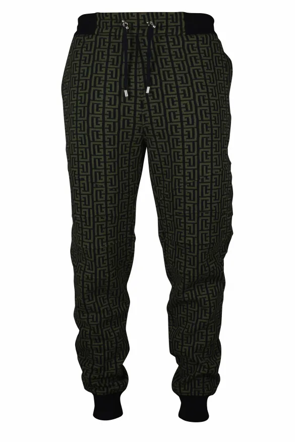 Balmain kaki en zwarte joggingbroek.Balmain monogram.Geribbelde gebreide tailleband met trekkoord.Opgezette achterzakken.55% katoen, 45% polyester.