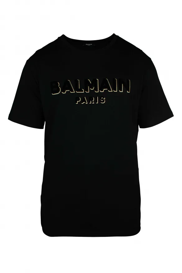 Oversized zwart T-shirt van Balmain.Getextureerd logo op de voorkant met gouden details.Korte mouwen.Ronde kraag.100% katoen.Gemaakt in Italië.
