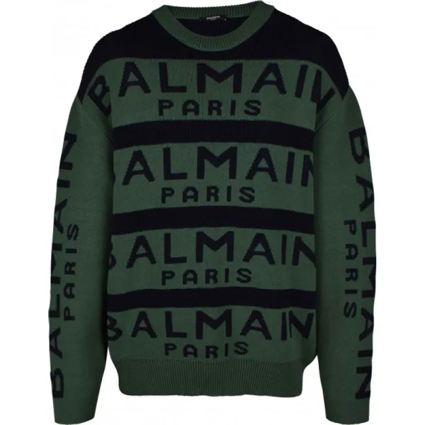 Groene wollen trui van Balmain.Marineblauw logo en details op voor- en achterkant.Lange mouwen.Ronde kraag.Geribde randen.Gemaakt in Italië.