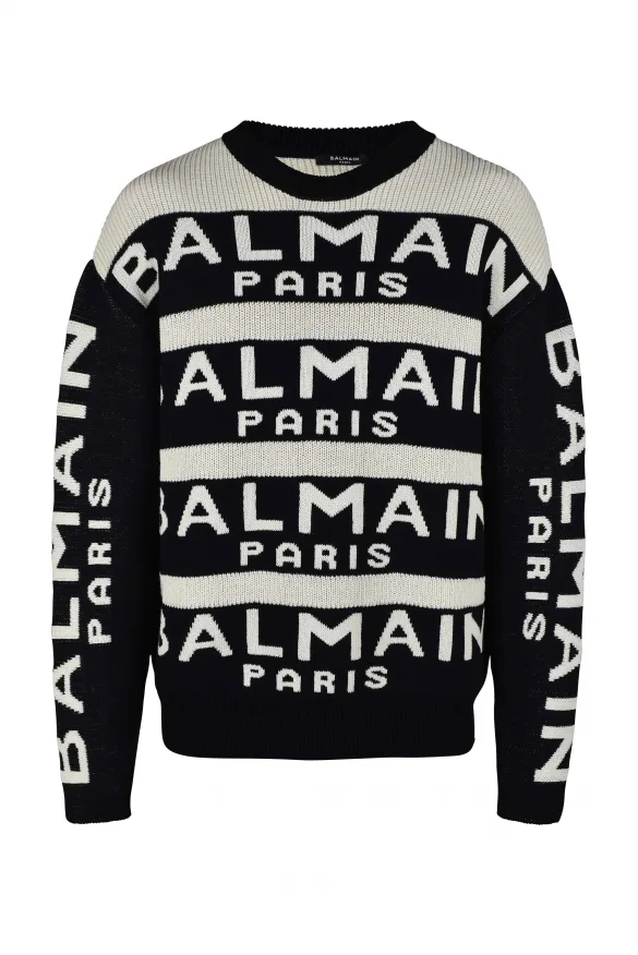 Zwart-witte wollen trui van Balmain.Zwarte strepen met wit logo.Zwarte lange mouwen met wit logo.Ronde kraag.Geribbelde randen.64% wol en 36% polyamide.Gemaakt in Italië.