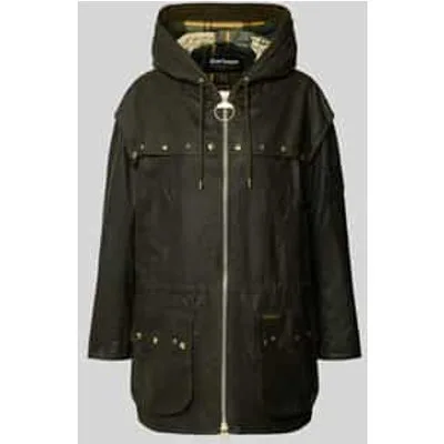 Functioneel damesjack van Barbour;Look: effen;Pasvorm: Regular fit ;Kraagmodel: Capuchon met tunnelkoord;Sluiting: Tweewegritssluiting;Motief binnenkant: Ruitjes;Applicatie: Labelstitching, labelopschrift, studs;Details: Achterpas, gun flap, tailleband aan de binnenkant;Mouwvorm: lange mouwen;Mouwboord: in de wijdte verstelbaar met drukknopen;Rompzoom: met rugsplitten;Zakken: Klepzakken op de borst, opgestikte voorzakken, binnenzak, klep op de mouwzak;Materiaal: puur katoen