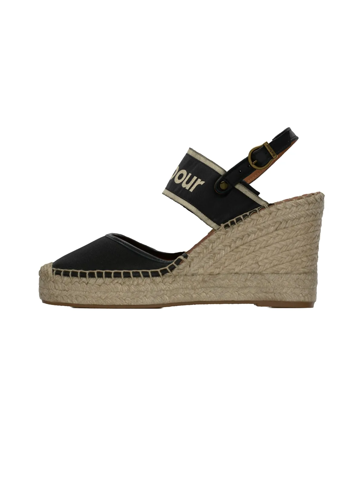 Design: Profielzolen, Verstelbare riemen, Hak/zool met raffia-look, Gesp; Type sluiting: Riemsluiting; Type hak: Sleehak; Materiaal: Textiel; Schoenneus: Ronde neus; Extra's: Label print, Flexibele zool; Hakhoogte: High heels (> 10 cm)