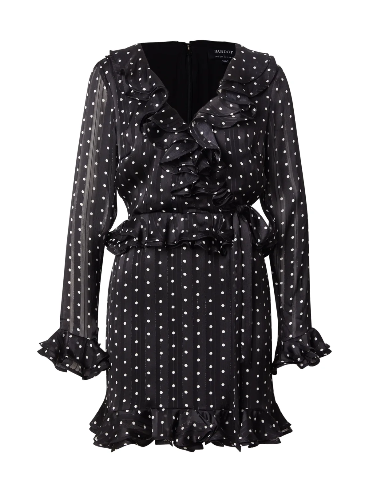 Design: Rug rits, Diepe snit/decolleté, Wikkel-look, Om te knopen/binden; Type sluiting: Ritssluiting; Halstype: V-hals; Motief: Gestippeld; Details: Volant, Gedrapeerd; Extra's: All-over patroon, Gladde stof; Lengte: Knielengte; Snit: Getailleerd; Pasvorm: Normale pasvorm; Armlengte: Lange mouw