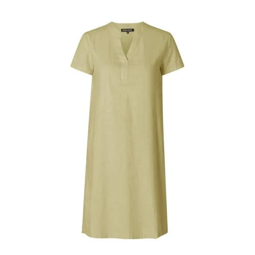 Deze damesjurk van Base Level Curvy is gemaakt van een linnenmix. De jurk met korte mouwen heeft verder een V-hals.details van deze jurk:splittenplooien