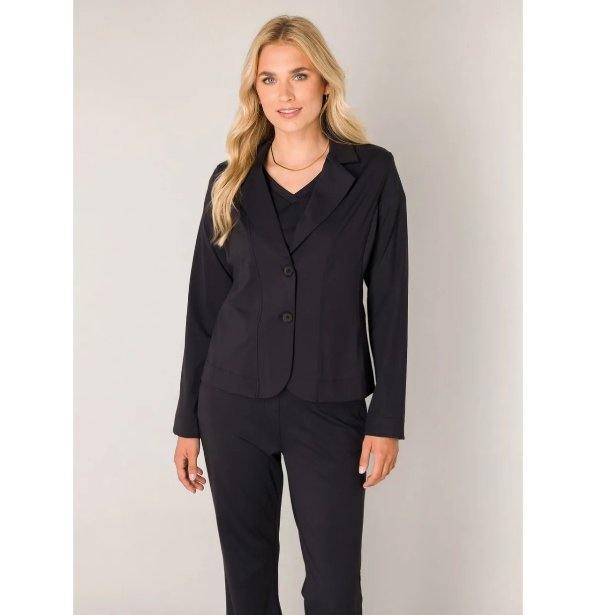 Deze damesblazer van Base Level heeft een lange mouwlengte en een reverskraag. De blazer is gemaakt van travelstof en heeft sierzakken. De blazer heeft geen sluiting, wat zorgt voor een moderne uitstraling.