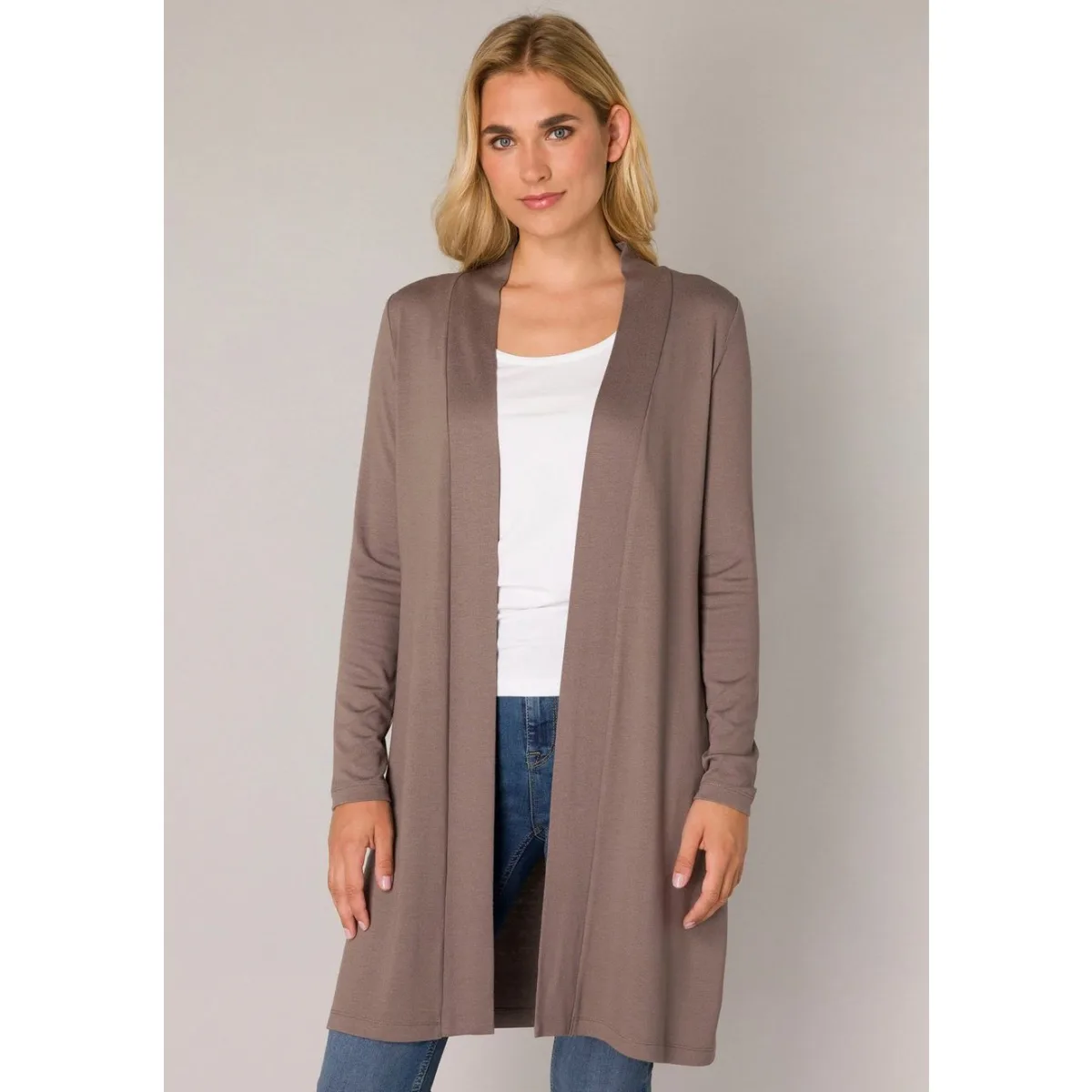 Dit vest voor dames van Base Level is gemaakt van een viscosemix. Het model heeft een openvallende hals en lange mouwen.