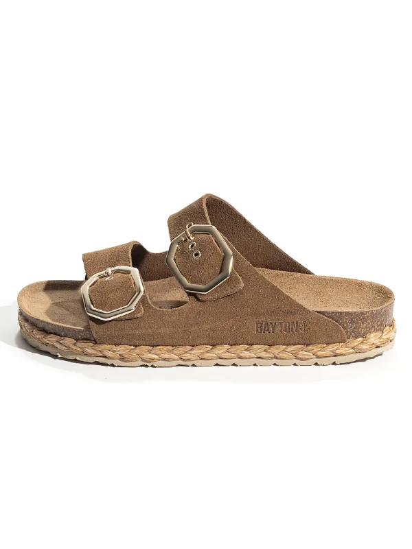 Design: Anatomisch gevormd voetbed, Hak/zool met raffia-look; Type sluiting: Slip; Materiaal: Leer; Motief: Effen; Materiaal: Suède; Schoenneus: Open toe; Extra's: Flexibele zool, Wijdte verstelbaar; Hakhoogte: Platte hak (0-3 cm)