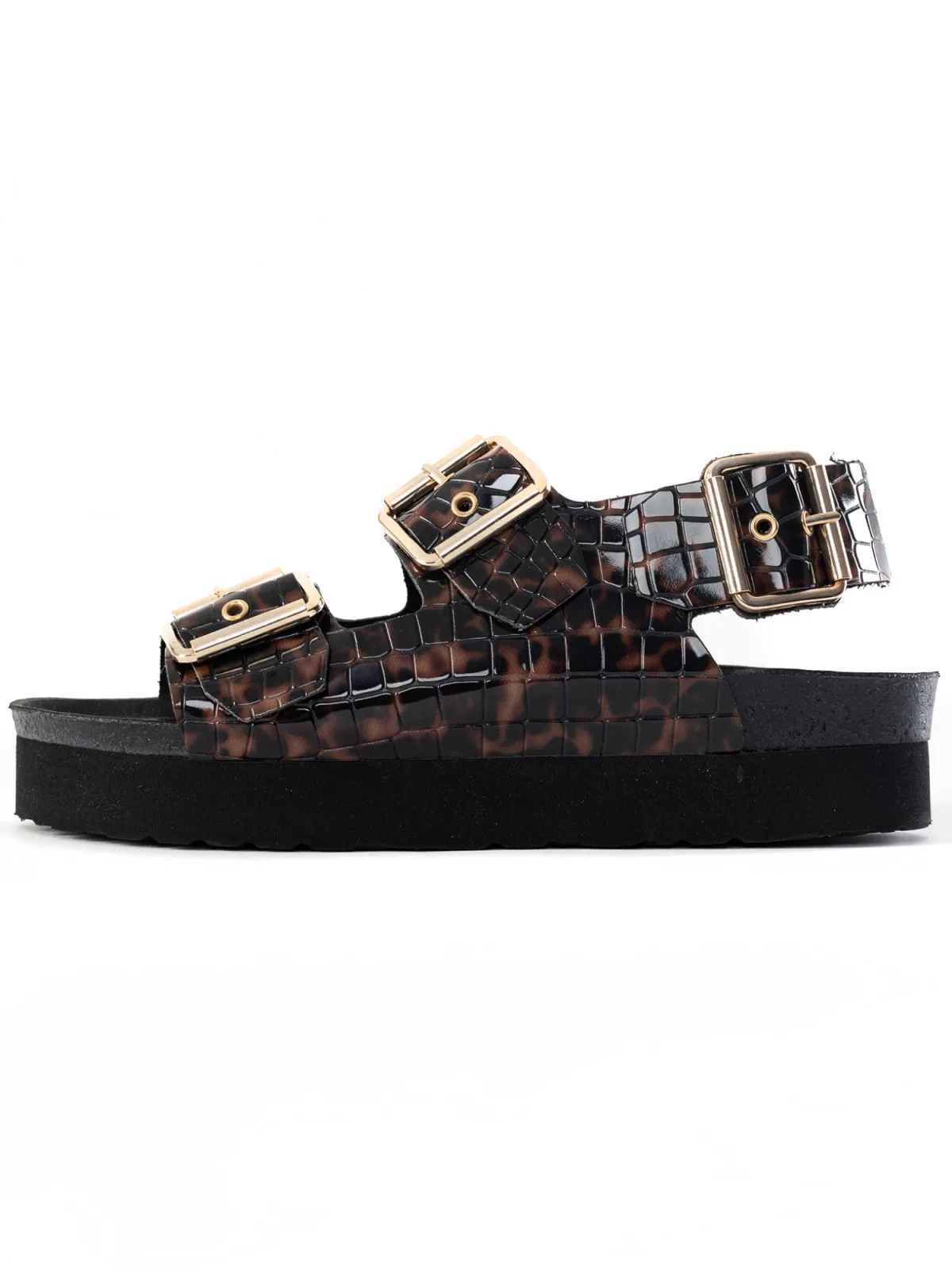 Design: Profielzolen, Verstelbare riemen; Type sluiting: Gesp; Motief: Dierenprint; Plateau: Met plateau; Materiaal: Imitatieleer; Schoenneus: Open toe; Extra's: All-over patroon, Niet-wegglijdende stof, Reptile look, Microvezels; Hakhoogte: Platte hak (0-3 cm)