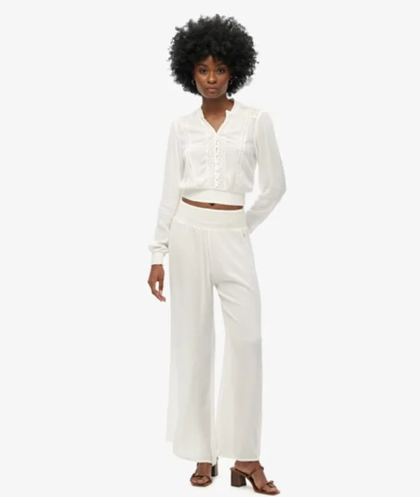 Met onze Beach-broek voeg je moeiteloos wat elegantie toe aan je zomergarderobe. Dankzij het comfortabele, lichte materiaal is deze broek perfect om mee op het strand te loungen, maar ook voor een dagje uit met warm weer is hij ideaal. De losse, wijde pijpen creëren een sierlijk silhouet en houden je koel en trendy, een winnende combo voor de hete zomermaanden. Elastische tailleband Wijde pijpen Kanten inzetstukken