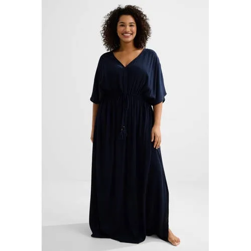 Geniet van ontspannen stranddagen in deze elegante BEACHWAVE Curve strandjurk in donkerblauw. Het lange model valt soepel om het lichaam en geeft een luchtige, comfortabele look die perfect is om over je badkleding te dragen. De V-hals en driekwartmouwen zorgen voor een vrouwelijk silhouet, terwijl de zachte viscose aangenaam licht aanvoelt op warme dagen.Luchtig model voor zonnige dagen Lange strandjurk in donkerblauw voor een rustige, tijdloze uitstraling Gemaakt van viscose, een zachte en soepele stof die prettig draagt Driekwartmouwen bieden net wat extra bedekking zonder te warm te worden V-hals die het decolleté subtiel accentueert Zonder sluiting, je trekt de jurk eenvoudig aan en uit over je badkleding Ideaal voor op het strand, aan het zwembad of tijdens een ontspannen wandeling over de boulevardComfortabele strandjurk voor elke getawayOf je nu een dag naar het strand gaat of de hele vakantie in een kustplaats doorbrengt, deze strandjurk is een praktische en stijlvolle basis. De lange lengte geeft een comfortabel gevoel wanneer je nog even een terrasje pakt of langs de winkels loopt na het zwemmen.BEACHWAVE Curve: speciaal ontworpen pasvormBEACHWAVE Curve richt zich op modellen die goed aansluiten bij rondere vormen. De pasvorm is afgestemd op extra draagcomfort, met aandacht voor zachte materialen en flatterende lijnen. Zo combineert het merk een moderne strandstijl met praktische details waar je iedere zomerdag plezier van hebt.Een fijne strandjurk die gemak en stijl samenbrengt, klaar voor elke zonnige dag.