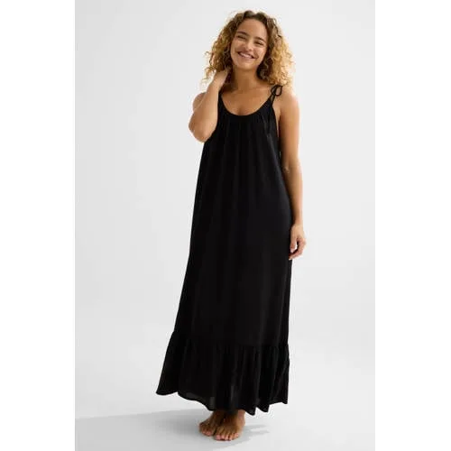 Deze zwarte strandjurk van BEACHWAVE is een lichte laag die je zo over je bikini of badpak aantrekt. Het effen design en de subtiele spaghettibandjes geven een rustige uitstraling, terwijl de ronde halslijn het model vrouwelijk maakt zonder op te vallen. Dankzij het luchtige materiaal beweegt de jurk soepel met je mee, ideaal voor warme dagen aan zee of bij het zwembad.Luchtig model voor boven je swimwear Gemaakt van 85% viscose, wat zacht aanvoelt en prettig draagt op de huid Aangevuld met een soepele stof die de jurk vormvast helpt blijven Spaghettibandjes laten je swimwear mooi zichtbaar op de schouders Ronde hals voor een rustige, tijdloze bovenkant Geen sluiting, je trekt de jurk eenvoudig over je hoofd aan en uit Effen zwarte kleur die makkelijk combineert met verschillende bikini’s en accessoiresPraktisch op het strand en bij het zwembadDeze strandjurk is handig wanneer je even iets over je swimwear wilt dragen. Bijvoorbeeld tijdens een wandeling naar de strandtent, onderweg naar huis of wanneer je op vakantie snel van ligbed naar lunch gaat. Door het lichte gewicht stop je de jurk gemakkelijk in je strandtas en haal je hem er net zo snel weer uit.Strandmode van BEACHWAVEBEACHWAVE staat bekend om swim- en beachwear waarin pasvorm en draagcomfort belangrijk zijn. De collecties sluiten aan op de huidige badmodetrends en combineren dat met praktische ontwerpen voor aan het strand en bij het zwembad. Zo kies je voor items die je de hele stranddag door gemakkelijk blijft dragen.Een veelzijdige basic voor in je strandtas, klaar voor zon, zee en relaxte momenten.