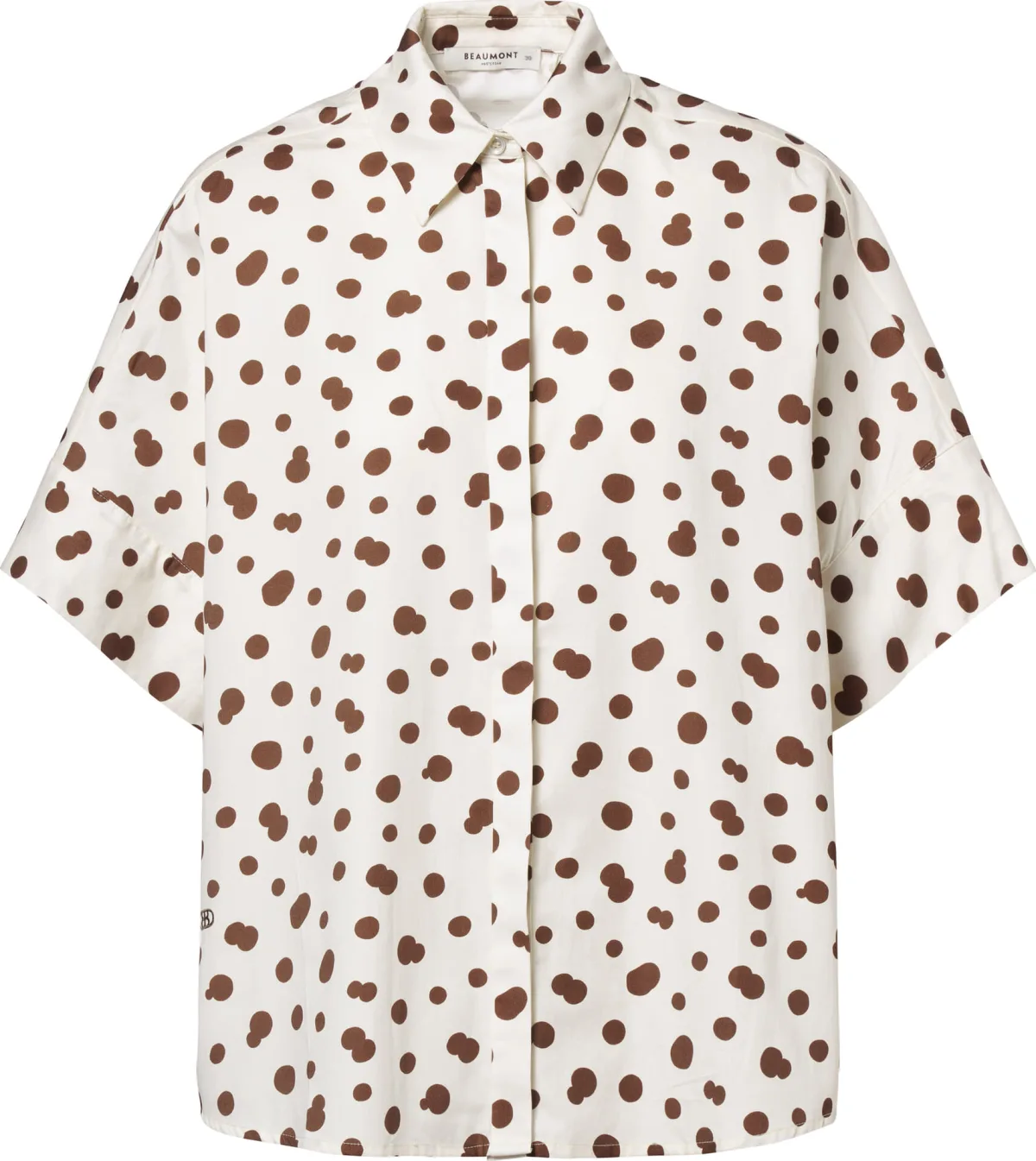 De Blouse April van Beaumont is een stijlvolle blouse met korte mouwen en een speels stippenpatroon. Ontworpen met een opstaande kraag en handige zakken aan de voorkant, biedt deze blouse een casual en toch verfijnde uitstraling, ideaal voor diverse gelegenheden.