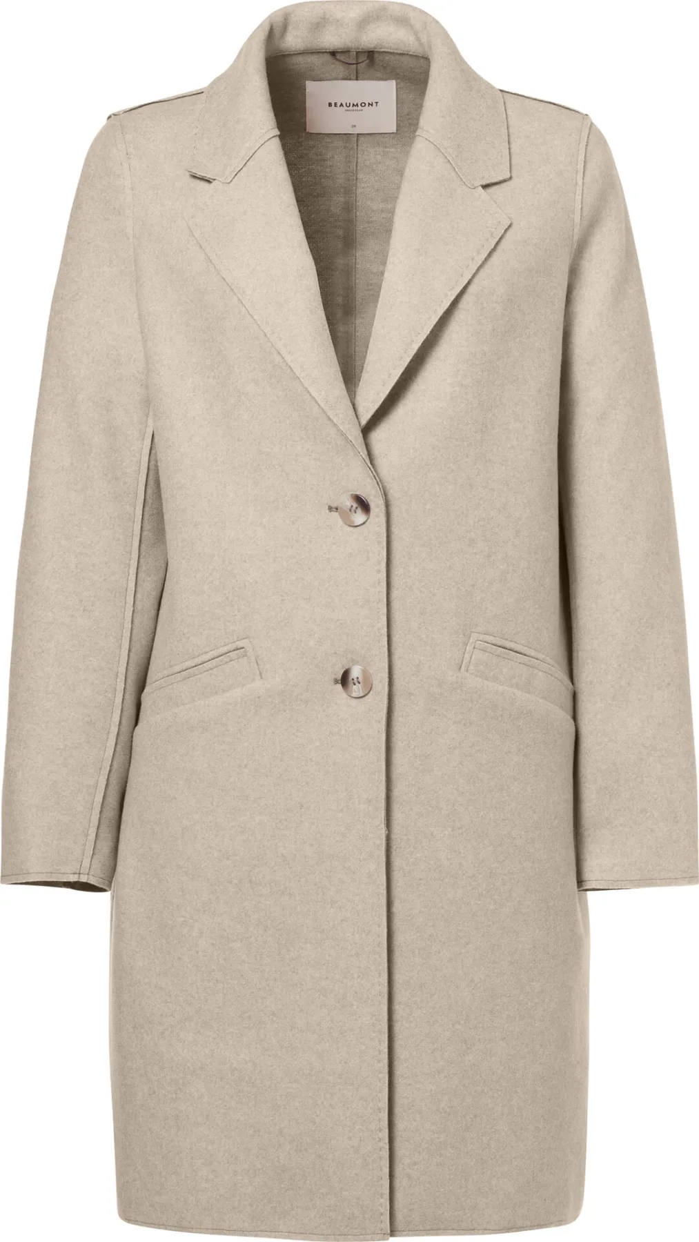 De Wollen Jas Jazzy van Beaumont is een elegante dames wollen jas met een reverskraag en knoopsluiting. Deze sophisticated jas heeft lange mouwen, voorzakken en een effen patroon, perfect voor nette gelegenheden. De regular pasvorm biedt comfort en stijl.