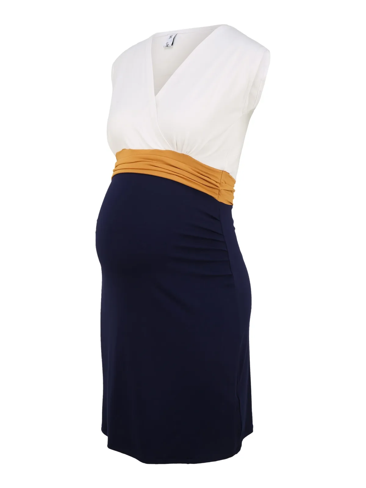 Design: Gevoerde zoom/rand, Tailleband, Getailleerd model; Materiaal: Viscose; Halstype: V-hals; Motief: Color-Blocking; Soort bandjes: Brede bandjes; Details: Gedrapeerd, Wikkel design; Extra's: Gladde stof, Tricolor look; Borstvoedingsfunctie: Zonder borstvoedingsfunctie; Lengte: Knielengte; Pasvorm: Slanke pasvorm; Armlengte: Mouwloos