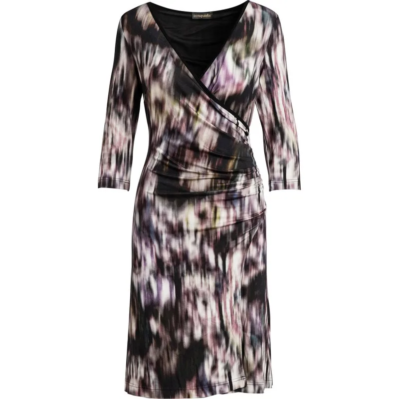 Imitatiewikkeljurk van bedrukte jersey met stretch – viscose-elastaan. Driekwartmouwen. Dubbele stof aan de voorkant. Zwarte bies in de halslijn. Lichtjes geplooid links in de taille. Voering van stretchstof aan de achterkant.