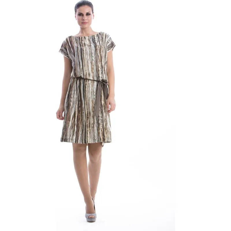 Jurk CONQUISTA in gebreide patroonstof in khaki en beige tinten. Boothals. Sack-silhouet. Losse pasvorm. Knielengte. Kan gedragen worden met een riem (niet inbegrepen). Het model is 1,77 m lang en draagt maat 36/S. 83% viscose, 14% acryl, 3% elastaan.
