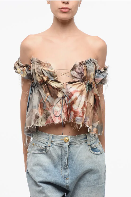 Specificaties: Bedrukte zijden off-shoulder top in veelkleurig
