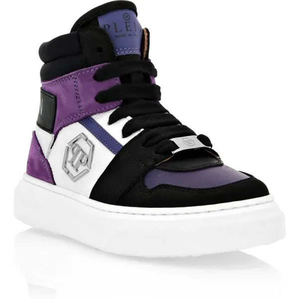 Deze mid-top sneakers geven kinderkasten een gedurfd statement, gemaakt van luxueus leer en ontworpen voor opvallende street style. Perfect voor het verheffen van casual outfits, ze bieden zowel comfort als houding. Premium kalfsleerconstructie voor een slanke, verfijnde afwerking gestructureerd Midden-top silhouet met ondersteuning en stijl kenmerkende zeshoekige logopatch voor een kenmerkende Plein-aanraking voering van kalfsleer zorgt voor comfort en ademend vermogen stevige rubberen buitenzool biedt stabiliteit en duurzaamheid