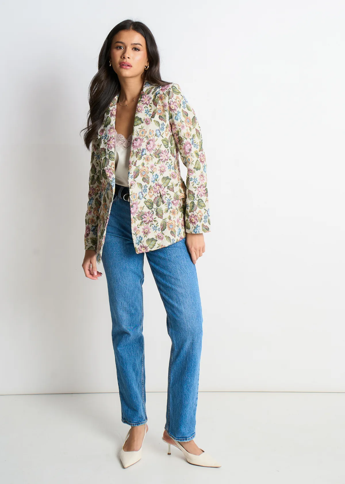 Beige bloemenjacquard getailleerd jasje Prijzen