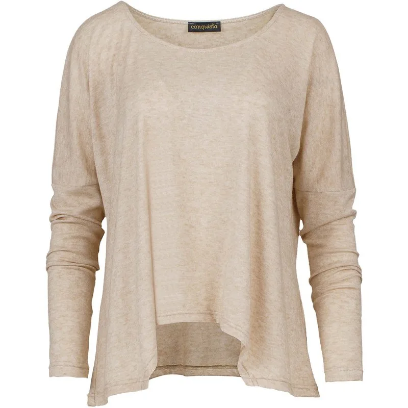 Beige gemêleerde gebreide zakdoekzoomtop. Deze beige gemêleerde top is gemaakt van stretch gebreide stof. Het heeft een wijde ronde hals en lange vleermuismouwen. Het heeft een vloeiende zakdoekzoom. De top is gestileerd in een ontspannen A-lijn silhouet.