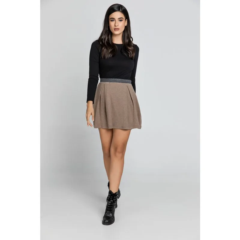 Beige minirok met een donkergrijze tailleband. Twee omgekeerde plooien voor en achter. Verborgen ritssluiting opzij. Gevoerd met stretchstof. A-lijn silhouet. Ons model is 176cm en draagt maat 36/S. Afmetingen voor maat 36/S (in cm): Taille-37, Onderkant-62, Lichaamslengte-47. 49%viscose-34%acryl-11%wool-4%cashmere-2%elastan. Accessoires zijn niet inbegrepen.