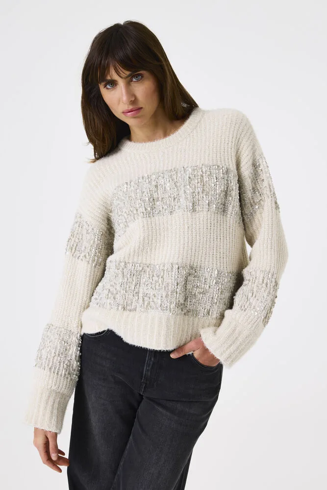 Trui met pailletten streeppatroon. Deze trui heeft een ronde hals, lange mouwen en een relaxed fit. Dit item is gemaakt van 40% polyester, 40% gerecycled polyester en 20% polyamide. Dit GARCIA kledingstuk is gemaakt met gebruik van recyclede garen. Recyclede materialen worden gemaakt uit restmateriaal, wat weer wordt omgezet tot grondstof.